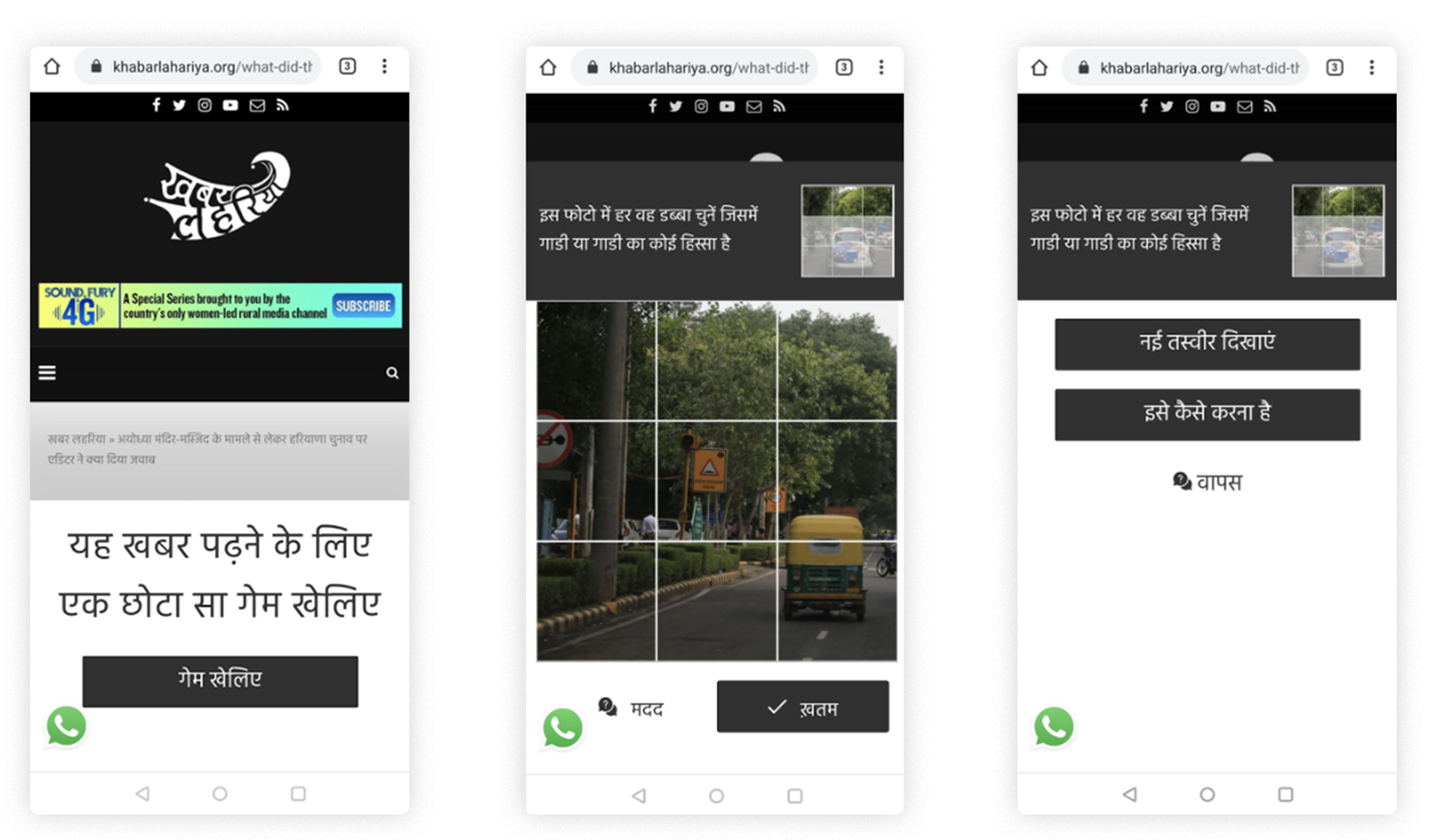 Conducting extensive research on KL’s audience in rural areas gave us a lot of direction for designing our widgets, especially from a user experience perspective. For instance, a lot of readers we interviewed were familiar with reCAPTCHA widgets, which are frequent fixtures in the Indian Railways ticket reservation app. Therefore, for the initial phase of the pilot, we curated a dataset of images taken from a car dashboard and created a widget where readers have to identify squares containing cars, similar to reCAPTCHA tasks. Our interviewing in Banda also equipped us with a better understanding of what on-screen instructions were easy to follow, which was particularly useful when we translated our instructions for widgets that would be deployed on Hindi articles.